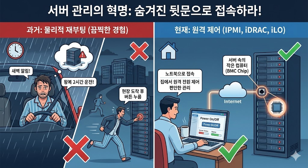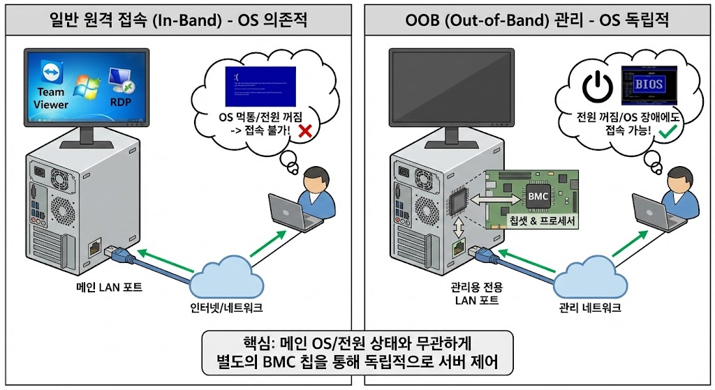 전문 용어로 이를 OOB(Out-of-Band) 관리라고 합니다. 메인 데이터 통신망(Band) 바깥(Out)에서 별도로 관리한다는 뜻입니다.