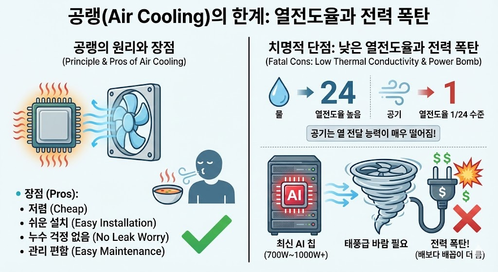 - 단점: "공기는 열을 전달하는 능력이 매우 떨어집니다." 물에 비해 열전도율이 1/24 수준밖에 안 됩니다.