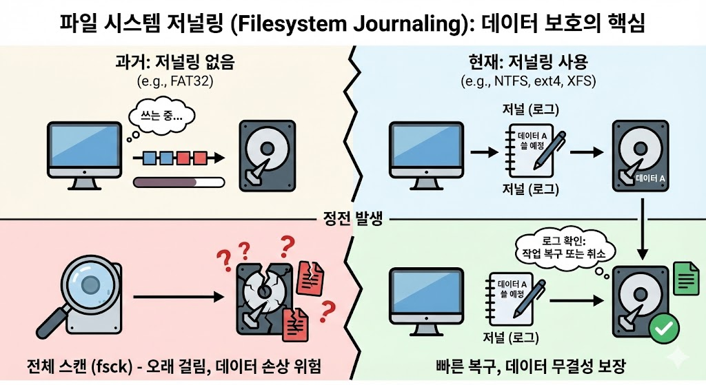 저널링이 없는 옛날 시스템(FAT32 등)은 어디까지 썼는지 기록이 없어서 파일이 깨지거나 디스크 전체를 스캔(fsck)해야 했습니다.