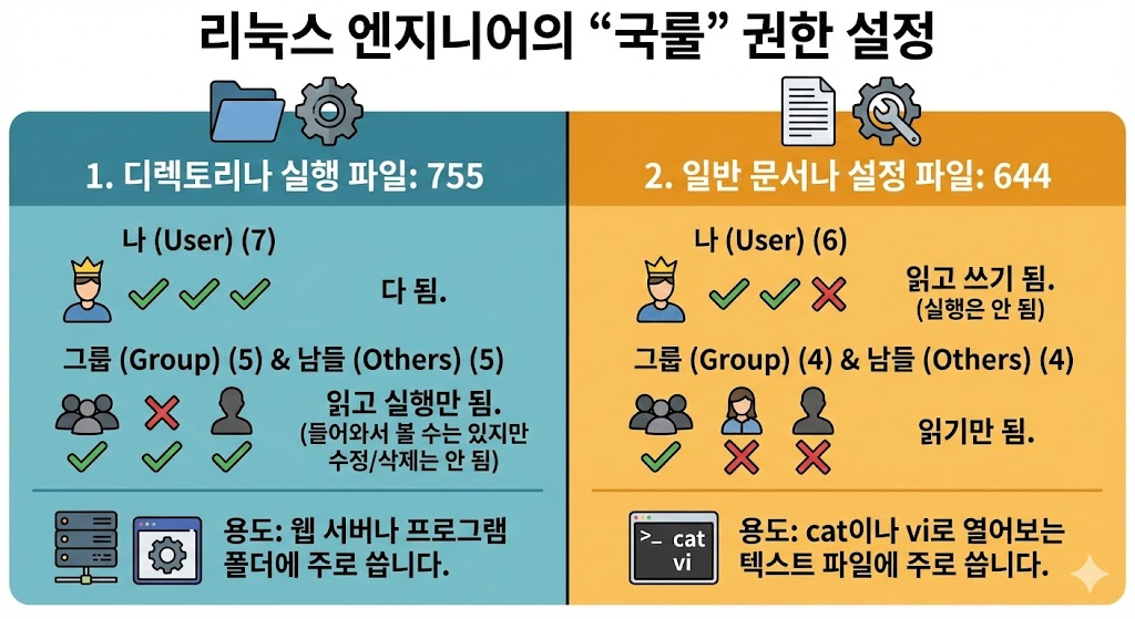 - 그룹(5) & 남들(5): 읽고 실행만 됨. (들어와서 볼 수는 있지만 수정/삭제는 안 됨)