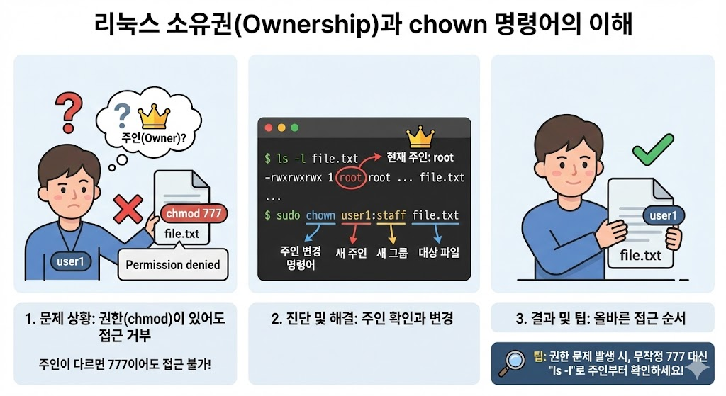 권한(chmod)이 완벽해도 "Permission denied"가 뜰 때가 있습니다. 바로 "주인(Owner)"이 달라서입니다.
