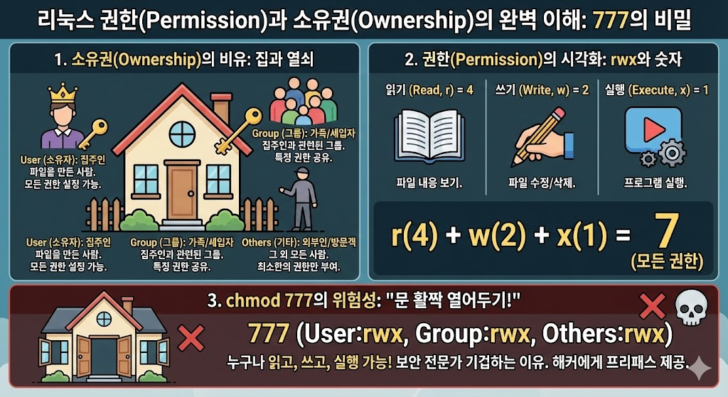 오늘은 리눅스 보안의 기초인 권한(Permission)과 소유권(Ownership)을 완벽하게 이해해 봅니다.