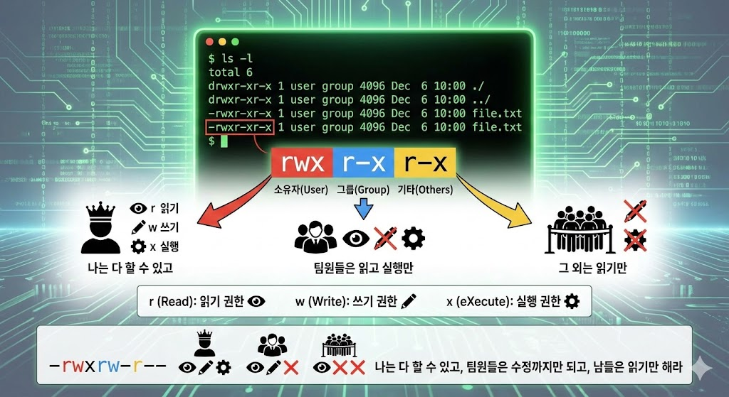 터미널에서 ls -l을 치면 파일 목록 앞에 -rwxr-xr-x 같은 외계어가 보입니다. 이것이 바로 권한 설정입니다.