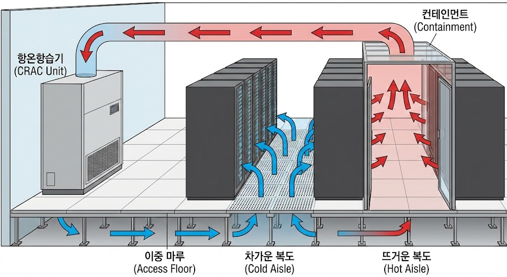 이 흐름이 섞이지 않도록 차가운 복도(Cold Aisle)와 뜨거운 복도(Hot Aisle)를 물리적으로 격리하는 컨테인먼트(Containment) 기술도 필수적입니다.