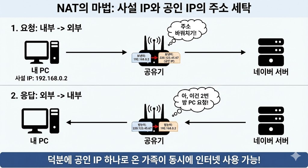 내 PC(192.168.0.2)가 네이버에 접속하려고 하면, 공유기는 이 요청을 가로채서 보낸 사람 주소를 우리 집 공인 IP(220.123.45.67)로 바꿔치기해서 네이버에 보냅니다.