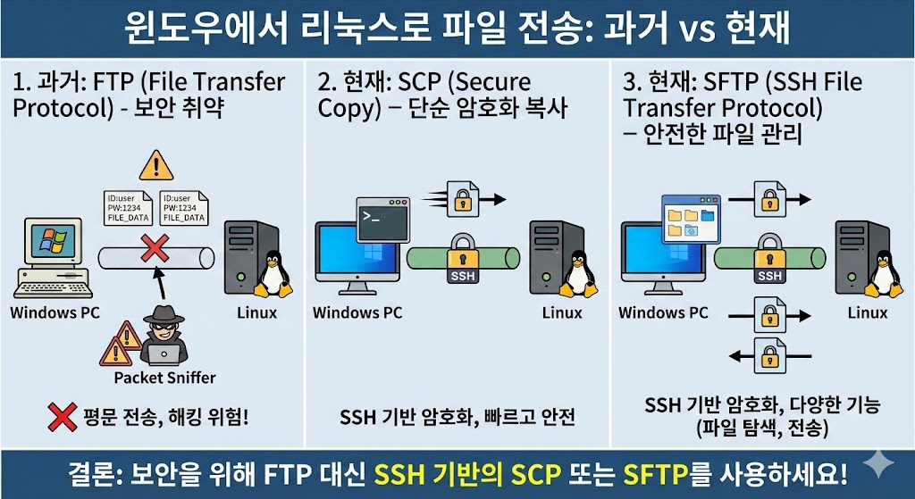 윈도우끼리는 공유 폴더나 USB로 쉽게 옮기지만, 리눅스는 파일 시스템이 다르고 보안이 엄격하기 때문입니다.