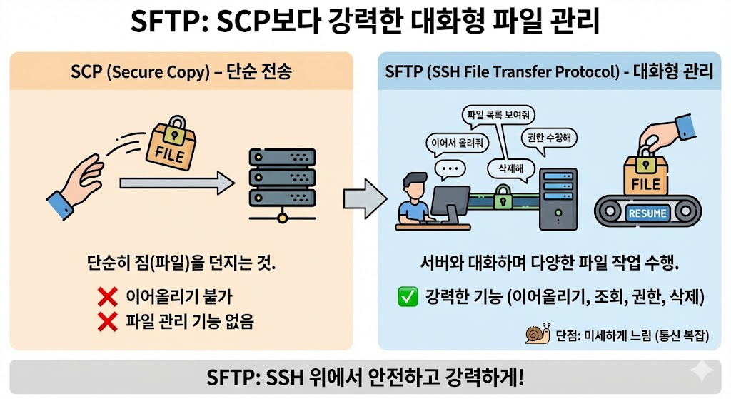 SCP가 단순히 짐을 던지는 것이라면, SFTP는 서버와 대화를 하며 파일을 다룹니다.
