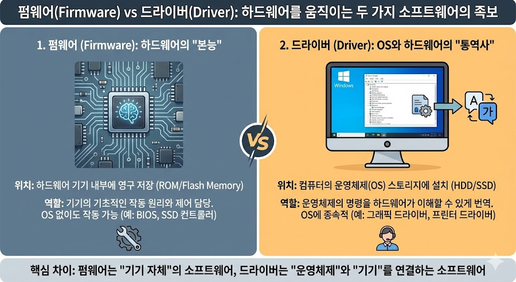 하드웨어가 이상 작동을 한다면, 가장 먼저 "통역사(드라이버)"를 바꿔보고, 그래도 안 되면 "영혼(펌웨어)"을 수술하는 것이 순서입니다. 이 차이만 알아도 PC나 서버 관리의 절반은 해결된 셈입니다.