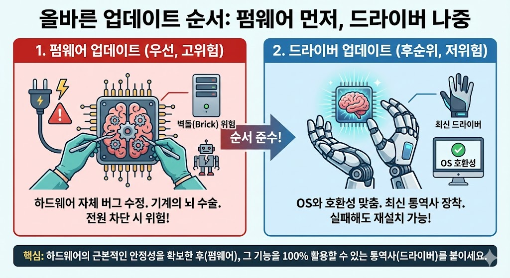 장애 처리를 위해 업데이트를 해야 한다면 순서가 중요합니다. 엔지니어링의 정석은 "펌웨어 먼저, 드라이버 나중"입니다.
