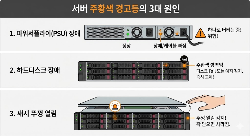 평화롭던 서버실에서 파란색(또는 초록색)으로 빛나야 할 서버 전면부 LED가 주황색으로 깜빡이고 있다면, 서버가 지금 "나 아파요! 빨리 좀 봐주세요!"라고 비명을 지르고 있는 것입니다.