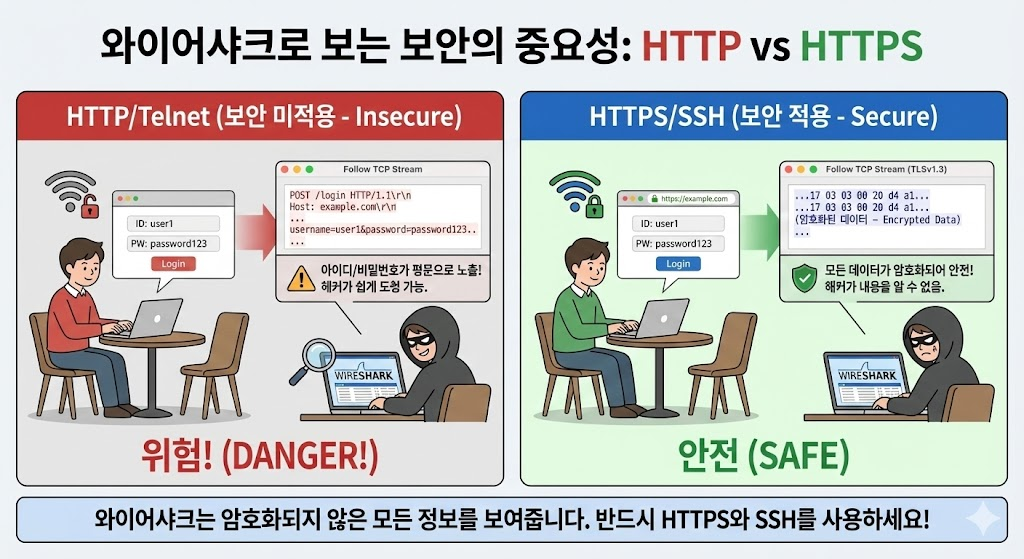 해커가 카페 와이파이 같은 곳에서 와이어샤크를 켜두고 있으면, 옆 사람의 정보를 훔쳐보는 건 일도 아니라는 뜻입니다. 반대로 HTTPS나 SSH를 쓰면 모든 데이터가 외계어처럼 암호화되어 안전하다는 것도 눈으로 확인할 수 있습니다.