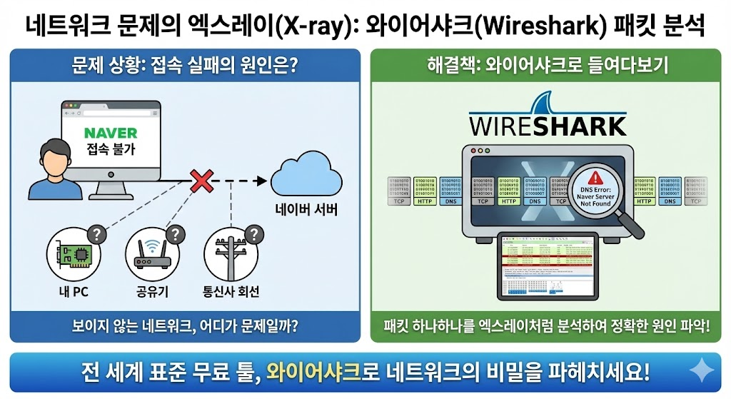 눈에 보이지 않는 네트워크 통신 과정을 엑스레이(X-ray)처럼 낱낱이 보여주는 도구, "와이어샤크(Wireshark)"가 정답입니다.