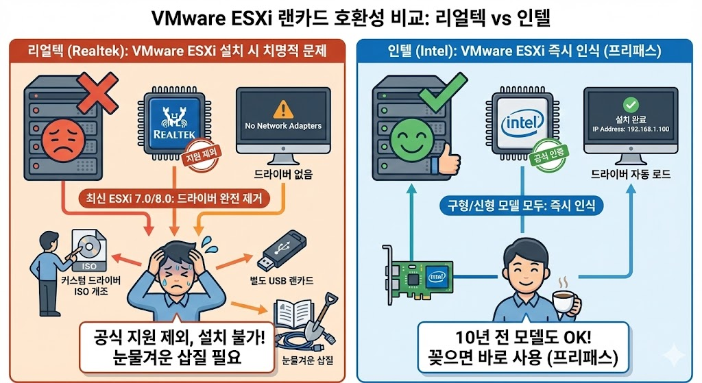 이게 가장 치명적인 문제입니다. 서버 가상화의 제왕인 VMware ESXi는 안정성을 위해 '공식 인증된 부품'만 지원합니다.