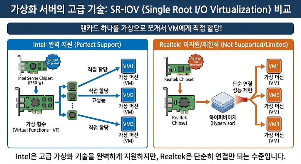 - Intel: 서버용 칩셋(i350 등)은 이 기능을 완벽하게 지원합니다.