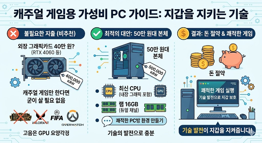 최신 CPU(내장 포함) + 램 16GB(듀얼 채널) 조합이면 50만 원대 본체로도 충분히 쾌적한 PC방 환경을 만들 수 있습니다.