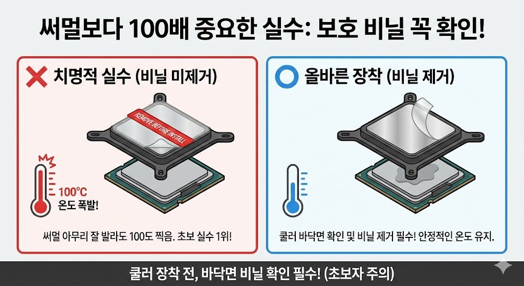조립 초보자가 가장 많이 하는 실수 1위이니, 쿨러 장착 전에 바닥면을 꼭 확인하세요.