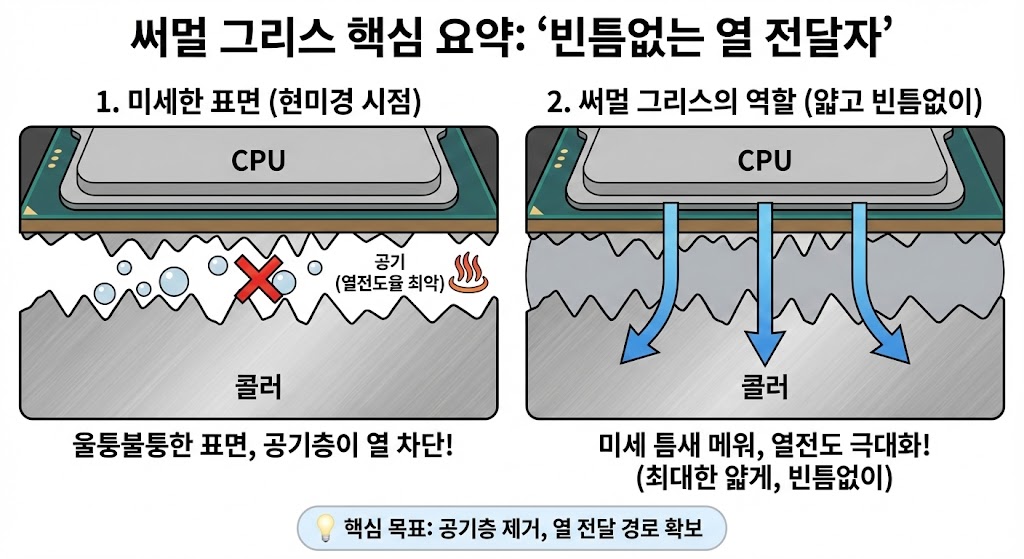 이 틈새를 메워서 열이 쿨러로 잘 전달되게 하는 '접착제' 역할이 바로 써멀 그리스입니다.