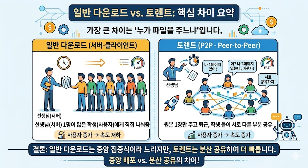 토렌트 (P2P): 선생님은 원본 1장만 주고 퇴근합니다. 학생 100명이 서로의 유인물을 복사해서 돌려봅니다.