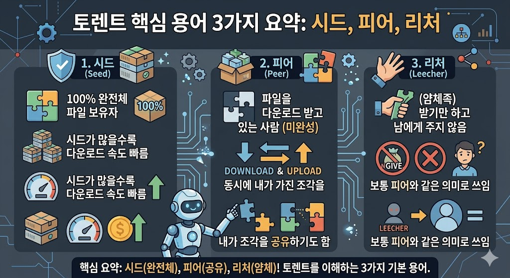 시드 (Seed): 파일 조각 100%를 다 가지고 있는 사람 (완전체). 시드가 많을수록 다운로드 속도가 빠릅니다.