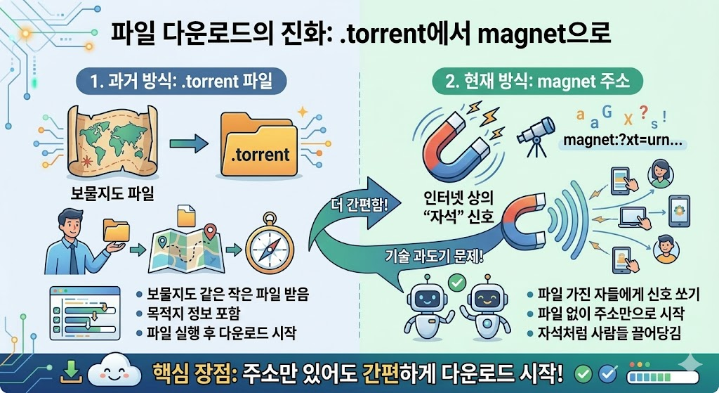 예전에는 .torrent라는 작은 파일을 받아서 실행했습니다. 이건 마치 "보물지도 파일"을 받는 것과 같습니다.