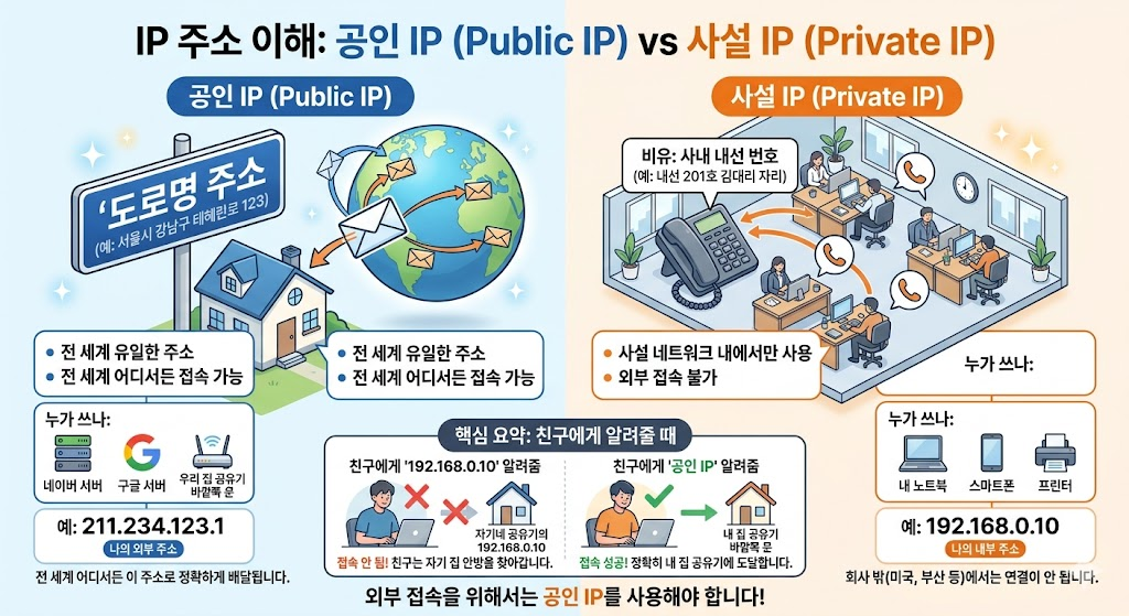 - 공인 IP는 전 세계에서 유일한 주소로 인터넷 통신이 가능하지만, 사설 IP는 공유기 내부에서만 통하는 가짜 주소로 외부 접속이 불가능하다.