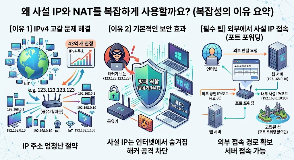 그냥 전 세계 모든 기기에 공인 IP를 하나씩 주면 편할 텐데, 왜 굳이 사설 IP와 NAT를 써서 복잡하게 만들었을까요?