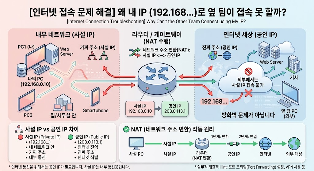 우리가 흔히 보는 192.168...로 시작하는 IP는 우리 집 안방이나 회사 사무실 안에서만 통하는 "가짜 주소(사설 IP)"입니다.
