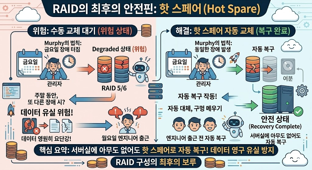 핵심 차이: 핫 스페어는 "즉시 투입 가능한 5분 대기조"이고, 콜드 스페어는 "창고에 있는 예비 부품"입니다.