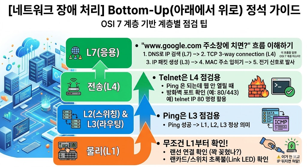 "장애 처리(Troubleshooting)의 정석"은 Bottom-Up(아래에서 위로) 방식입니다.