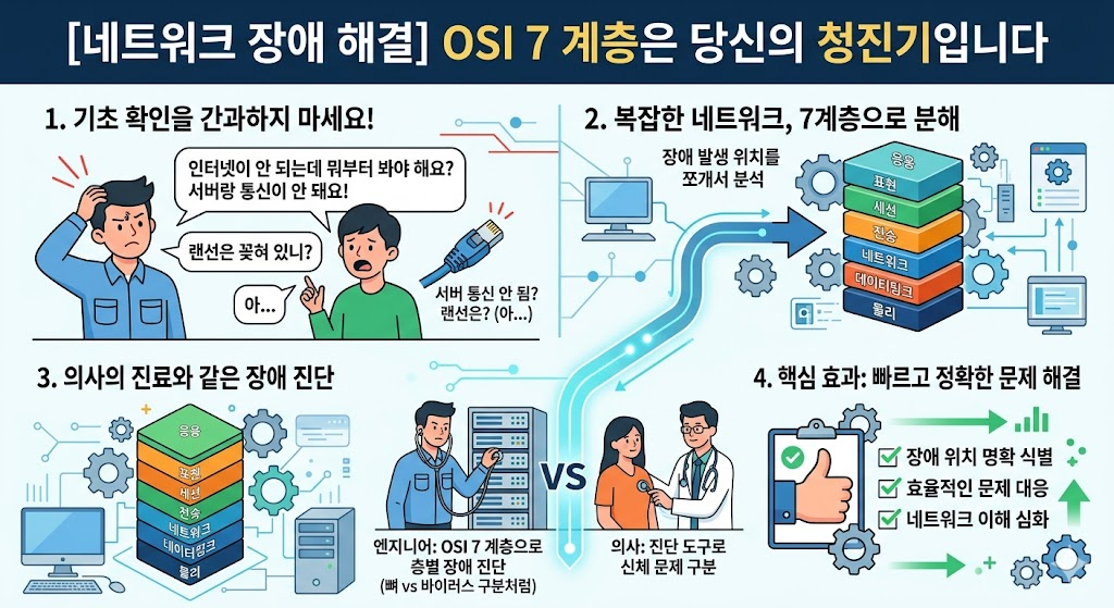 마치 의사가 환자를 진료할 때 뼈가 부러진 건지(하드웨어), 바이러스에 감염된 건지(소프트웨어) 구분하는 것처럼, 엔지니어에게 OSI 7 계층은 장애를 진단하는 청진기와 같습니다.