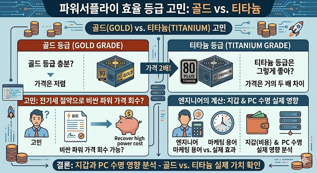 일반 게이머는 골드로 충분하며, 24시간 켜두는 서버나 무소음/최고 안정성을 원한다면 티타늄을 선택하세요.