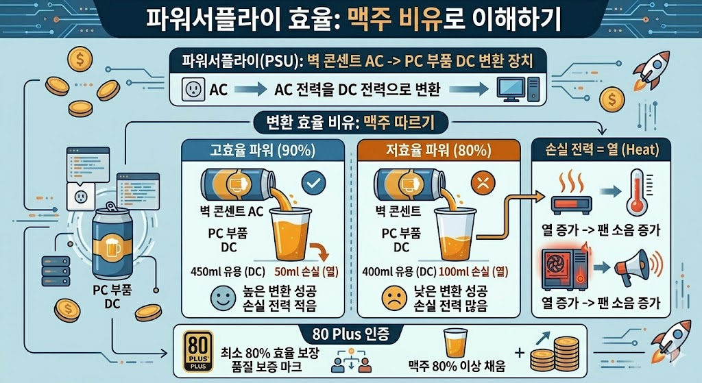 효율이 낮은 파워를 쓰면 컴퓨터가 더 뜨거워지고, 그 열을 식히려고 팬이 시끄럽게 돌아가는 이유가 바로 이겁니다.