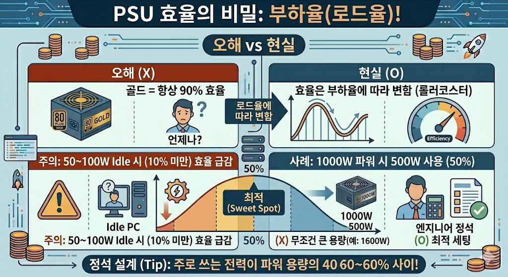 많은 분들이 오해하는 게 하나 있습니다. "내 파워는 골드 등급이니까 언제나 90% 효율이겠지?" 천만에요.
