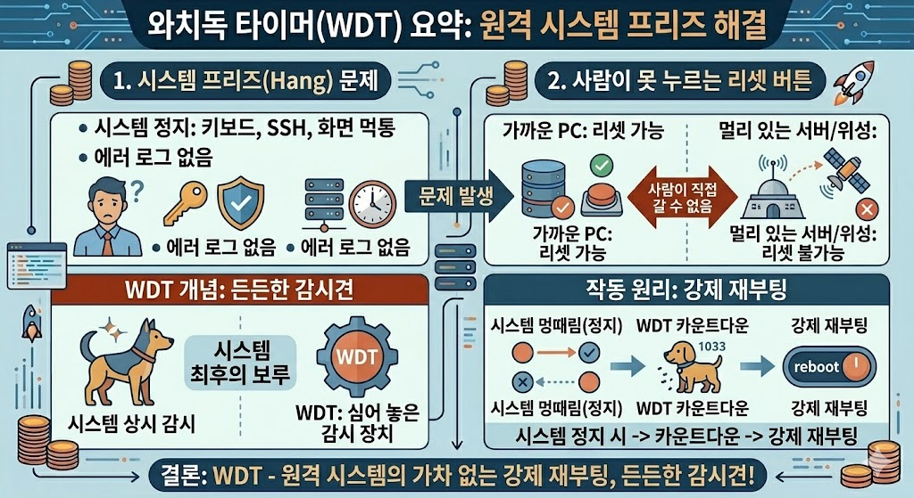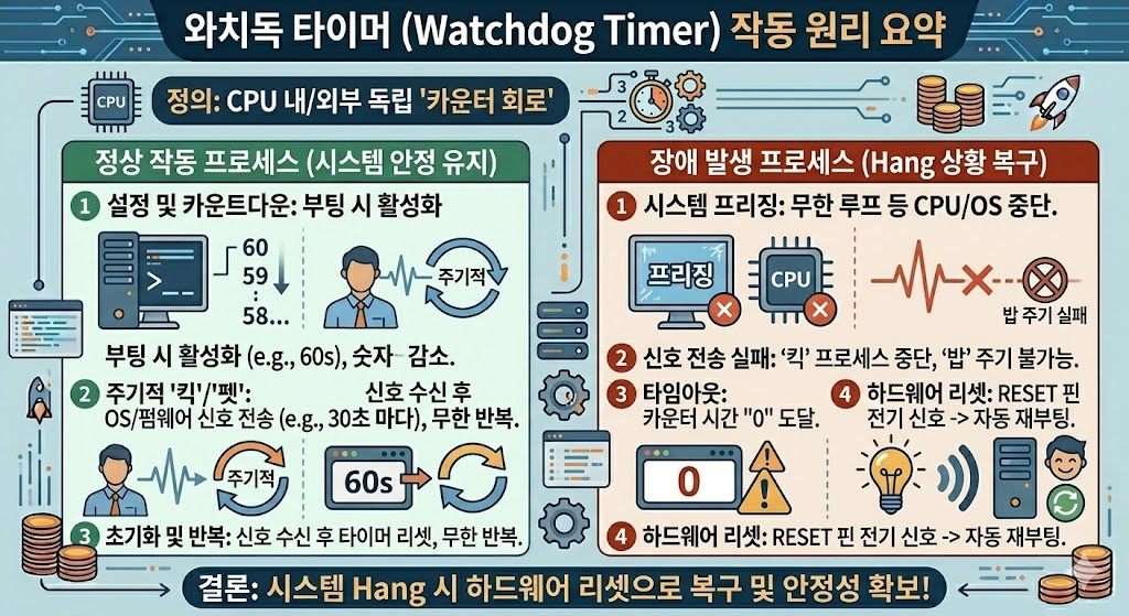 와치독 타이머는 시스템이 멈췄을 때(Hang), 외부 개입 없이 스스로 재부팅 하여 복구하는 하드웨어 안전장치입니다.