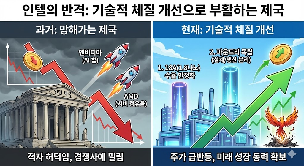 투자자들은 "너무 떨어져 오르는 것(데드캣 바운스)"이라고 의심하지만, 인텔 내부에서 기술적인 '체질 개선'이 확인되고 있습니다.