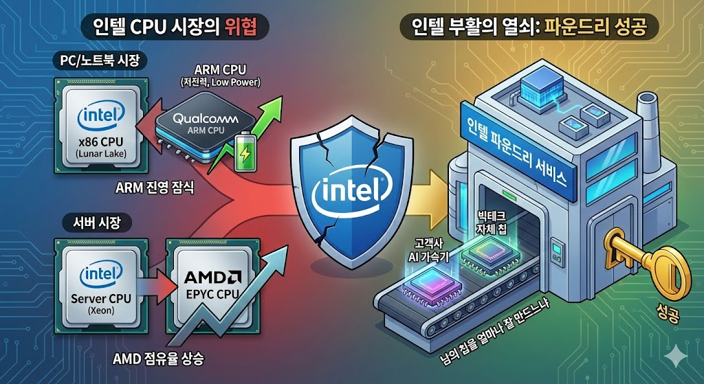 결국 인텔의 부활은 'CPU를 얼마나 많이 파느냐'가 아니라, '남의 칩(AI 가속기, 자체 칩)을 얼마나 잘 만들어주느냐'인 파운드리 성공 여부에 달려 있습니다.