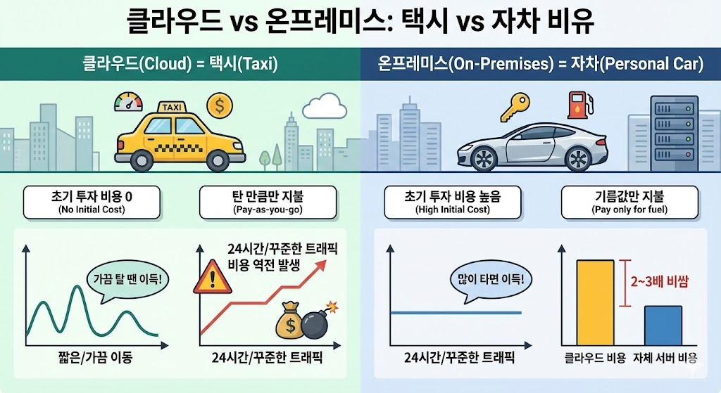 클라우드와 온프레미스의 차이는 '택시'와 '자차'로 비유할 수 있습니다.