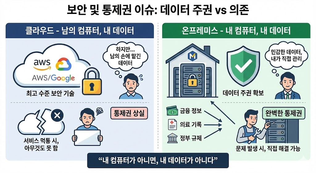 클라우드 서비스가 먹통이 되면(실제로 가끔 일어납니다) 우리는 아무것도 할 수 없지만, 자체 서버는 우리가 직접 고칠 수 있다는 '통제권'의 차이도 큽니다.