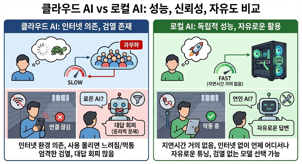 로컬 AI는 내 하드웨어 성능만 충분하다면 지연시간(Latency)이 거의 없습니다.
